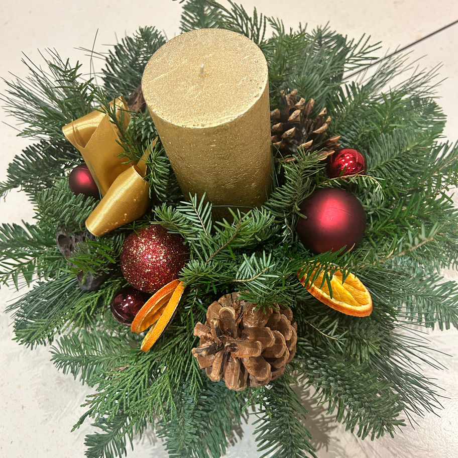 A timeless festive centrepiece crafted with lush seasonal evergreens, centred around a statement candle for a warm and inviting glow. Textured pinecones, dried orange slices, cinnamon sticks and subtle baubles are nestled among fragrant foliage, finished with a traditional ribbon accent. Rich in colour and natural detail, this arrangement brings classic Christmas charm to dining tables, mantels or sideboards, perfect for cosy winter gatherings and festive celebrations.