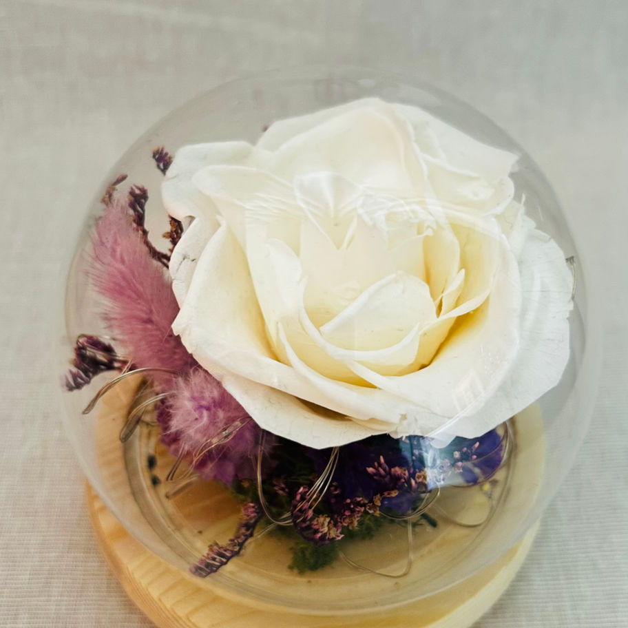 A timeless preserved rose arrangement, carefully displayed on a natural wooden base and surrounded by delicate dried florals. Designed as a lasting keepsake, this elegant piece captures the beauty of a single rose in a refined, minimalist form — perfect for meaningful gifts and special occasions.